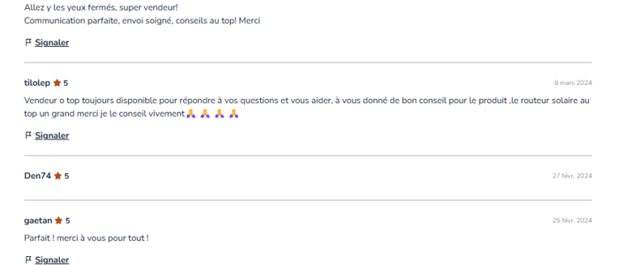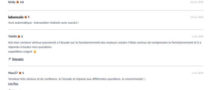 Publié sur Darbon StéphaneTrustindex vérifie que la source originale de l'avis est Google. Je recommande le routeur solaire Berdolo (F1ATB). Celui ci est bien construit avec des composants de qualité. J'ai pris un routeur triphasé avec 4 voies de 3kW chacune. J'ai choisi l'analyse de la consommation en triphasé avec un ''Shelly 3EM'' (Composant qu'il faut acheter en plus, le routeur Berdolo se connecte dessus pour faire son travail.) En monophasé, la pince ampèremétrique est intégrée au routeur Berdolo. Et merci pour le support technique et le professionnalisme dont vous avez fait part.Publié sur la bushTrustindex vérifie que la source originale de l'avis est Google. Je recommande sans hésiter les routeurs de mr berdolo top qualités merci à lui, pour sa réactivité et sa disponibilité même trois mois après l’achat il est présent pour les questionsPublié sur angeliqueTrustindex vérifie que la source originale de l'avis est Google. Sérieux matériel au top personne qui vous guide aussi bien dans les conseils que pour l'installationPublié sur jean-pierre hontarredeTrustindex vérifie que la source originale de l'avis est Google. Je recommande le routeur solaire Berdolo qui se distingue nettement de la concurrence par sa qualité de fabrication, sa fiabilité et sa précision. Là où beaucoup de solutions du marché ou en autoconstruction sont bien plus plus basiques et beaucoup moins durables, le Berdolo offre des résultats concrets sur l’autoconsommation et une réduction réelle du soutirage réseau. Matériel sérieux, très bien fini, fiable dans le temps, avec en plus un support technique très compétent et réactif. Une solution haut de gamme, loin des produits gadgets.Publié sur William PARENTINTrustindex vérifie que la source originale de l'avis est Google. Perfect !!! J'ai fais l'acquisition d'un routeur solaire, et il fait exactement le travail souhaité. Toute ma surproduction est renvoyée sur les 2 voies, soit cumulus, soit radiateur. Plus aucune perte ! Je consomme tout ce que je produis Le travail est soigné, et les composants de qualité. Et le plus important, des conseils et un suivi permanent. Merci pour tout çà. Je recommande vivement.Publié sur didier dubasTrustindex vérifie que la source originale de l'avis est Google. Je recommande sans hésiter le site de mr berdolo merci à lui, pour sa réactivité et sa disponibilité Et ses explications et conseils d’utilisation du RouteurPublié sur Sylvain BallandTrustindex vérifie que la source originale de l'avis est Google. Des bons conseils et un suivi attentif et patient.Publié sur Jérémie RobinTrustindex vérifie que la source originale de l'avis est Google. Routeur parfait et de très bonne qualité. Amortissement de l'achat 10 mois.Publié sur TV GUYOMTrustindex vérifie que la source originale de l'avis est Google. En plus d’avoir un matériel performant et fiable revelant de vrai es économies, Olivier est aussi présent et très précieux sur les conseils de mise en place et d’exploitation du matériel ; tant sur le scope électrique que domotique. Je recommande.Publié sur Mathieu MontagneTrustindex vérifie que la source originale de l'avis est Google. Je recommande fortement Olivier ! Il a répondu à toutes mes questions sur les routeurs , envoie rapide et conseils de qualitéCharger plusCertifié par: TrustindexLe badge vérifié de Trustindex est le symbole universel de confiance. Seules les meilleures entreprises peuvent obtenir le badge vérifié, avec une note supérieure à 4.5, basée sur les avis des clients au cours des derniers 12 mois. En savoir plus